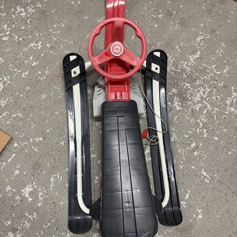 Akebrett / snowracer. Ble ødelagt da barna falt på den i bakken. Rattet og det ene skiet knakk, se bilder. Gikk likevel fint å renne på det etterpå. Har limt og teipet det etterpå. Vet ikke om det kommer til å holde. Tror det er mer sannsynlig at rattet holder enn at skiet holder. Uansett går det fint å renne på det med et brukket ski.