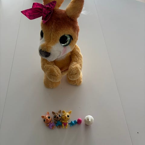 Kenguruen Josie fra Fur Real. Denne interaktive leken svarer på berøring med fler enn 70 ulike lyder og bevegelser, som for eksempel matelyder og nusselyder. Kenguruen kan danse og kan gjøre en artig hoppedans og spille musikk! Du får med en kenguru og tre kengurubabyer.