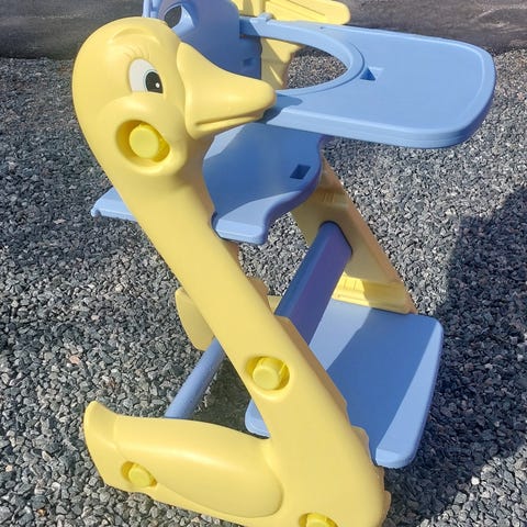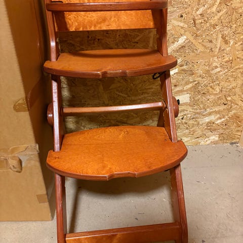 Tripp trapp stol til salg. Den er synlig brukt, særlig øverst på rygglenet. Den er fullt funksjonell, og det er ingen svekkelser i konstruksjonen
