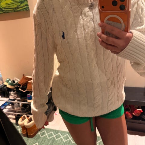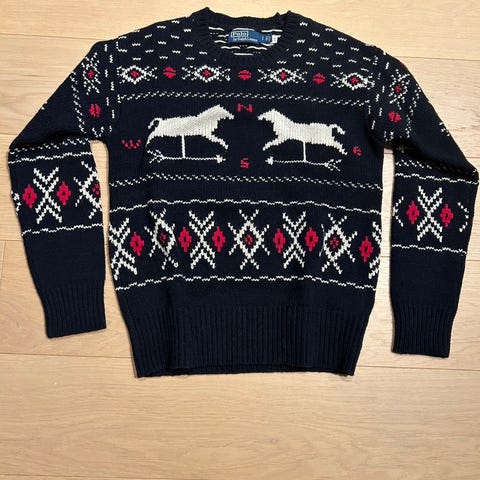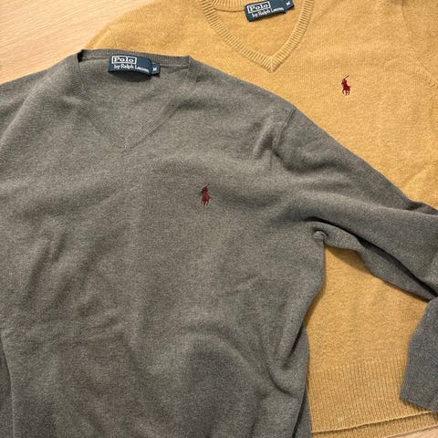 Ralph Lauren ullgenser i størrelse S for herre. Genseren er rosa og laget av ullmateriale. Den har et flettemønster og en rund hals.