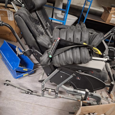 Massasjebenk med blått skinn og justerbar hodepute. Defekt motor, ukjent feil.