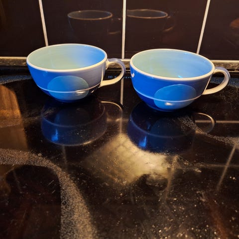 Håndmalte kopper med blå blomster. Koppene har et mønster med blå blomster og grønne stilker på hvit bakgrunn. Egnet for servering av varme drikker.