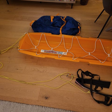 Ekspedisjonspulk i oransje farge med tau. Brettet er laget av plast. Designet for enkel transport og frakt på lange og korte skiturer. Har fulgt meg tett i noen år, men skal skiftes ut med en pulk som rommer mitt barn nå;)