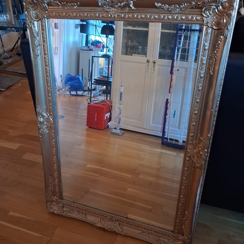 Flott speil med ramme i gullfarge. Speilet har detaljerte ornamenter og en klassisk design som kan brukes til dekorasjon i ulike rom. 83 cm langt og 63 cm bredt. Må hentes 😊