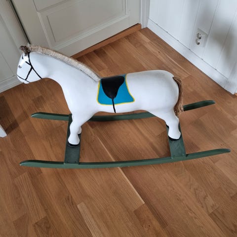 Cloisonne hest av eldre årgang selges. Total lengde er 40 cm, høyde 24 cm. Den har en skade i den ene foten som gjør den noe ustø, men kan stå. Flott med mange fine detaljer.
