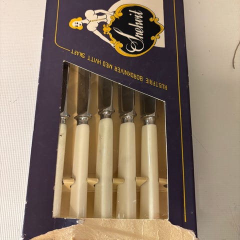 Knivene har håndtak i lyst tre eller ben.