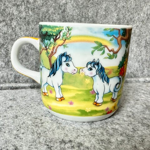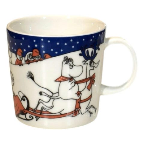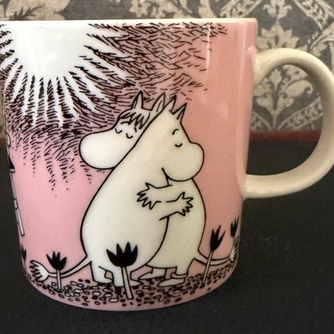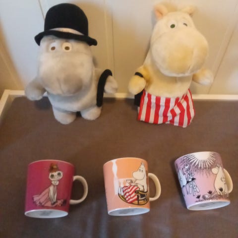 Arabia Mummitrollet barne-servise i rosa. Settet inkluderer en kopp, en bolle og en tallerken med motiver av Mummitrollet-karakterer. Dette settet har aldri vært brukt.