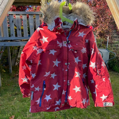 Det er skjoldene enkelte steder på jakka (innsiden på høyre arm nederst) som gjør at jeg skriver synlig brukt.