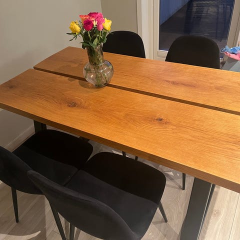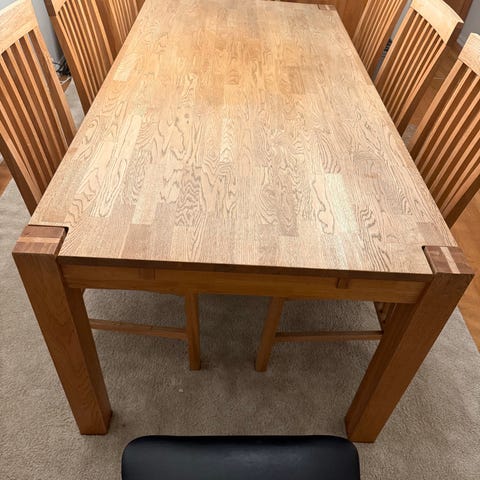 Spisebord i eik. Har noen bruksmerker, men kan pusses og oljes.