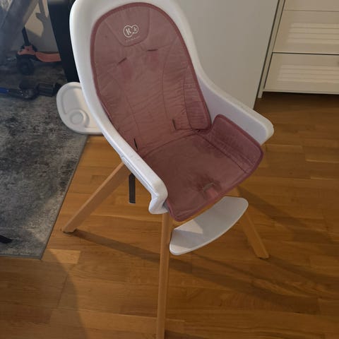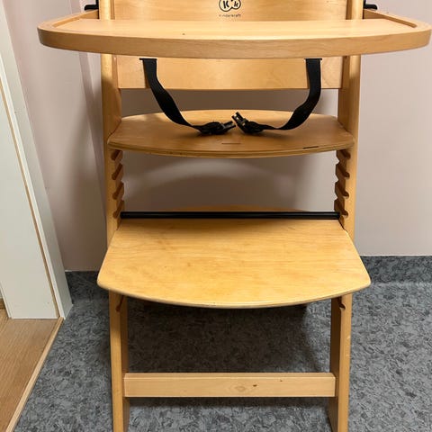 Dette er en veldig smart barnestol som passer til høye bord/kjøkkenøy/bar. På bildene har den korte bein på, som gjør at den passer til normale spisebord. Det føler med andre ben som kan settes på som gjør stolen høyere. Kan brukes med og uten bøyle. Det følger også med et brett som kan tas av og på når bøylen brukes.