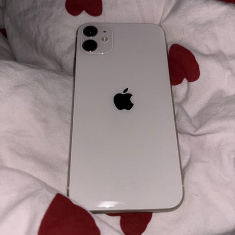 iPhone 11 i kvit, nesten ny kjøpt for 2 år siden. Telefonen er i god tilstand, har bare noen få bruksmerker på skjermen.