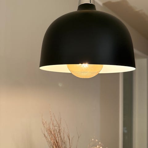 Sokkelen er i børstet stål og skjermen er lakkert i matt svart (hvit på innsiden). Ledningen er flettet i svart. Kan justeres i lengde. Maks lengde her er ca. 170-180cm.