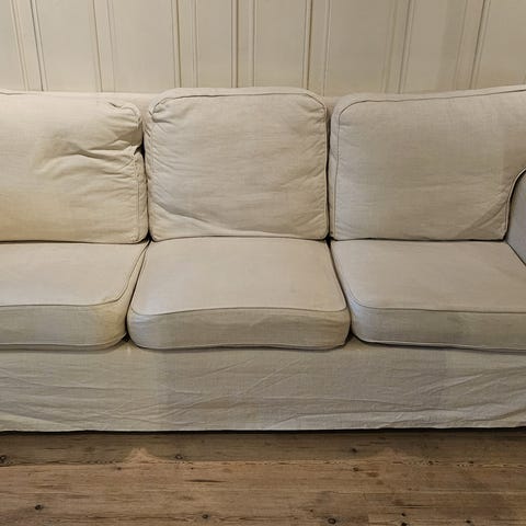 Pent brukt sofa med 2 seter og sjeselong på høyreside. Sofaen har plass til 4 - 6 personer, og har seteputer som gir en meget god komfort