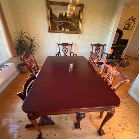 Selger et solid spisebord med 6 stoler. Ett av stolene trenger en enkel reparasjon. Det er bare å lime med trelim, ellers er møblene i generelt god stand.