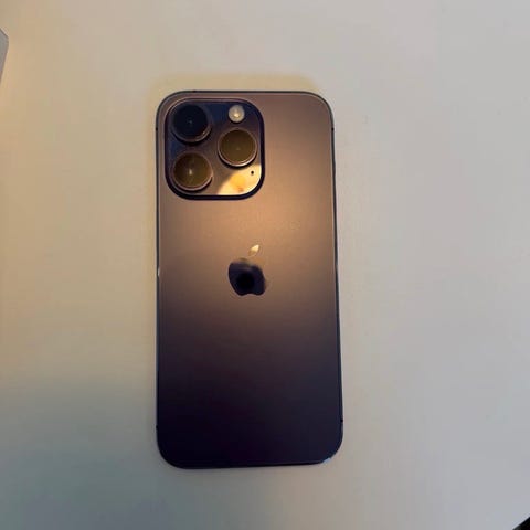 Apple iPhone 14 Pro mobiltelefon med 256 GB lagringskapasitet. Enheten har en svart farge og er svært pent brukt. Er noen små hvite merker på den ene langsiden.