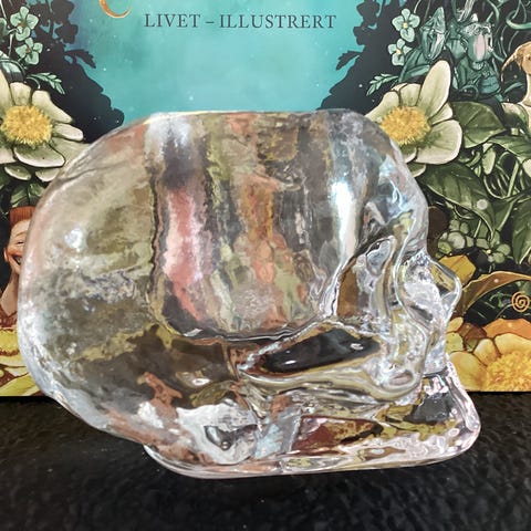 Vi har to elegante krystallysestaker fra Kosta Boda, formet som hodeskaller og designet for telys. Den ene er i klar krystall, den andre i en vakker dyp lilla nyanse. Perfekte som et unikt blikkfang i hjemmet ditt. Ta kontakt hvis du er interessert!