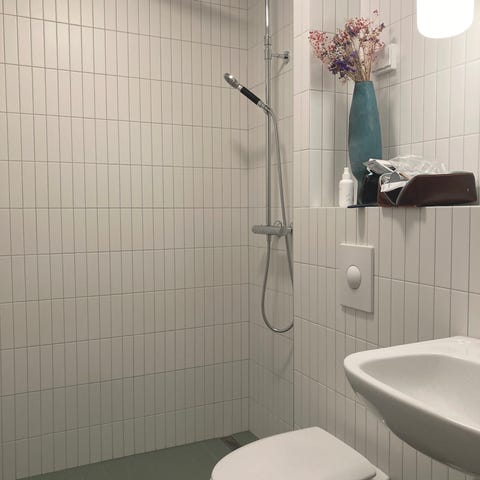 Blanke rosa veggfliser i tre forskjellige fargenyanser.