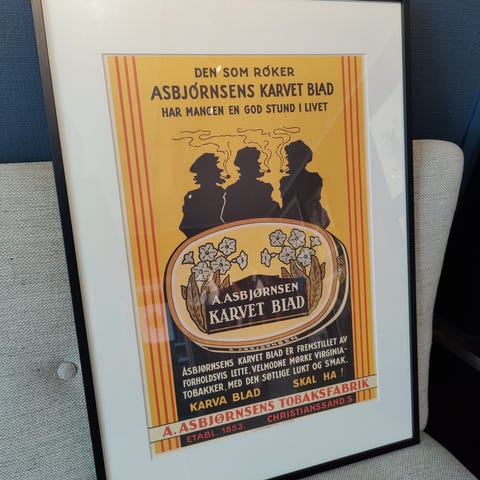 Innrammet silketrykk med motiv som viser en familie i grønn-/blåtoner, inkludert en kvinne, en mann og et barn. Bildet har et retrostilert preg og inneholder tekst på norsk. Plakaten er i stående format og har en lys bakgrunn.
