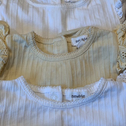 Newbie barneklær i størrelse 80, flerfarget design for jente. Klærne består av flere plagg med blomsterprint i ulike farger.
