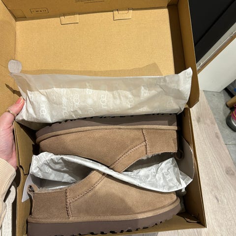 Selger et par myke og komfortable UGG tøfler i fargen brun/beige, størrelse 39/40. Perfekte som innetøfler – varme, behagelige og av høy kvalitet, slik UGG er kjent for.