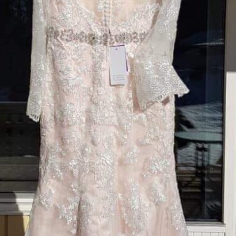 Brudekjole i fargen hvit, størrelse XL (eu 48) Kjolen har en lang lengde med splitt og draperinger.