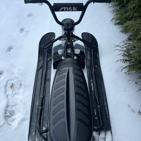 Brukt Stiga Snowracer, noe ødelagt plastikk bakerst på setet. Noe rust på metall.
