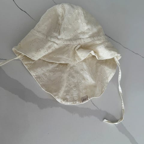 Selger to nydelige solhatter fra MP ,tilsvarer ca. 2–3 år.Begge har knyting under haken og sitter godt på hodet.