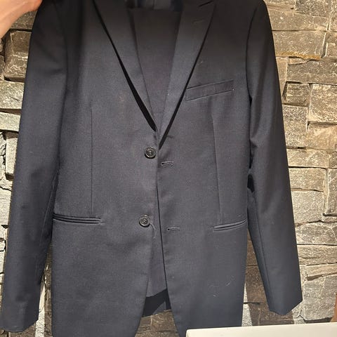 Sort dressjakke, sort dressbukse, hvit skjorte. Bruktx1. Fra H & M. Str 14+ (170).