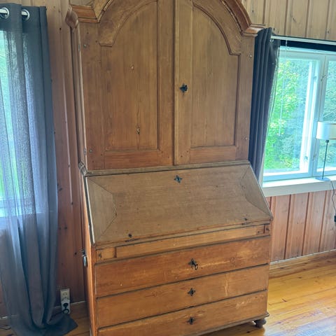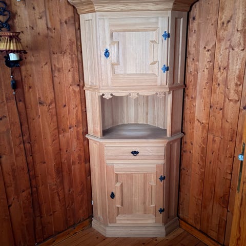 Antikk hjørneskap i tre med hyller og skuffer