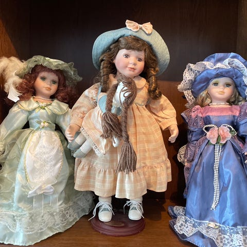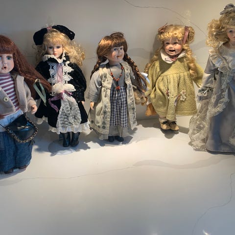 Dukkene har aldri blitt lekt med, kun stått lagret på en hylle. Selges samlet.