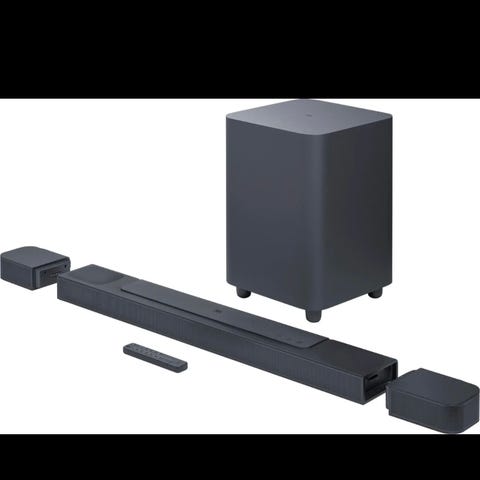 JBL lydplanke med tilhørende subwoofer. Enheten har kontrollknapper på toppen og tilkoblingsmuligheter bak. Denne er laget med Dolby visjon og Dolby atmos.