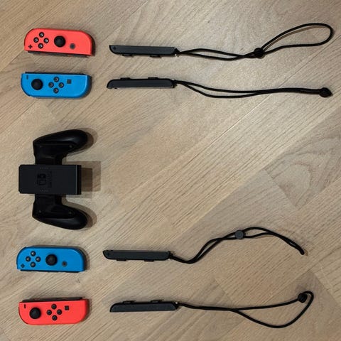 Nintendo Switch konsoll med hvite Joy-Con og tilbehør