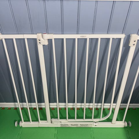 BabyDan sikkerhetsgrind i hvit metall. Passer til døråpninger og trapper.