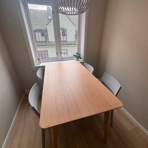 Spisebord, hvit bordplate, ben i hvitvasket eik. Pent brukt.