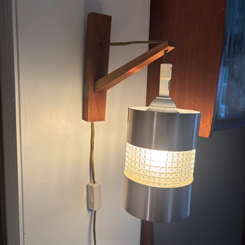 Retro vegglampe i teak med sylinderformet skjerm i sort og strukturert glass. Bryter/kopling boks i kopper. Stemplet med initialer S.A.