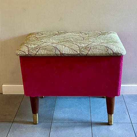 Fremstår i god stand, solid og stødig. Fungerer fint både som benk i entré og fotskammel for godstolen.