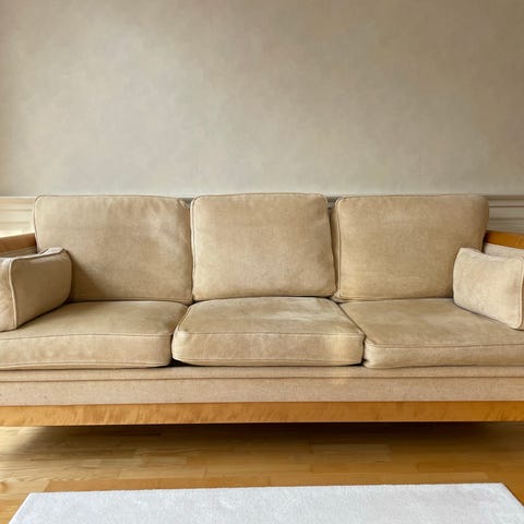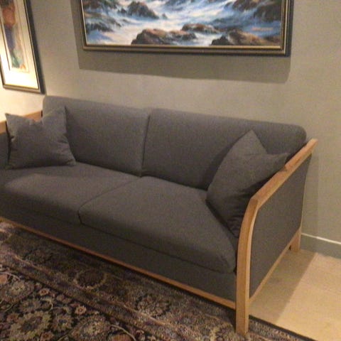 Pen Hødnebø Alf Sture stol med puff som er som veldig pen, og ingen slitasje. Den har dunputer og er trukket med super ullstoff fra Sellgren. Deilig lun og varm å sitte i!!