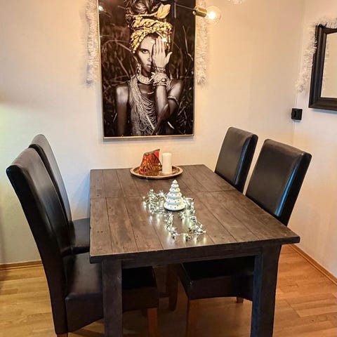 Unik Reclaimed spisegruppe – uttrekkbart bord + 6 stoler + speil, Massivt tre