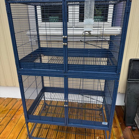 Buret har to etasjer, store frontdører som gir enkel tilgang, og står stødig på hjul slik at det er lett å flytte ved rengjøring.