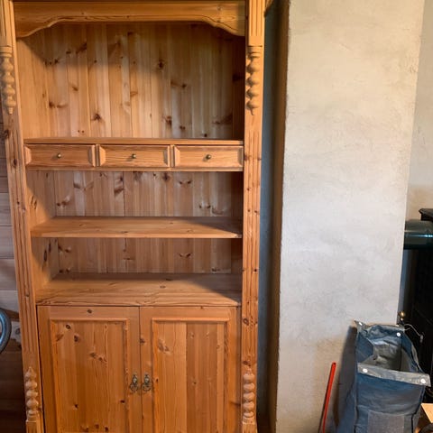 Pent, nesten ubrukt skap. Hvitt med dobbelt dør og lave ben. Må hentes.