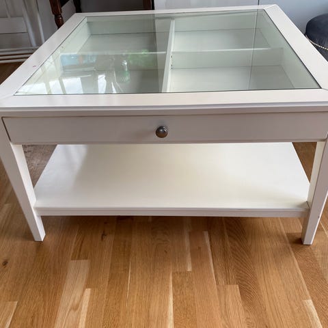 Pent brukt rundt sofabord med glassplate selges. Bordet er 75 cm og 46 cm høyt
