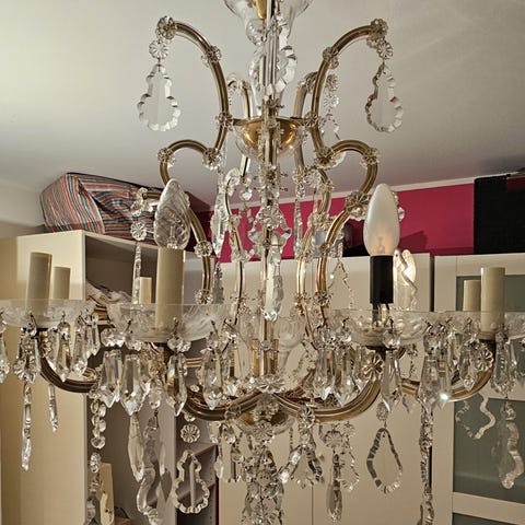 Lysekronen er i meget god stand. Jeg har dessverre ingen noe godt bilde av der lysekronen er montert. Den ble tatt ned på grunn av oppussing /ombygging og nå har vi dessverre ikke noe sted å ha den lenger.