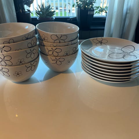 Nydelige Alv-serien grått mønster på hvit bunn, lite brukt. Selges, pga plassmangel, til under halv pris av veiledende butikkpris. Koppene og krusene har gode hanker og fine størrelser. Alt matcher fint og er lett å blande med andre hvite serviser.