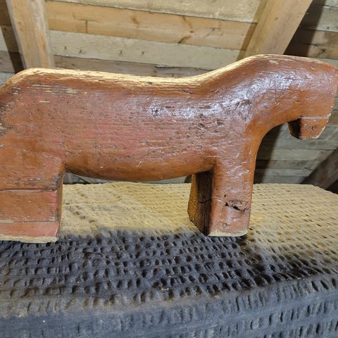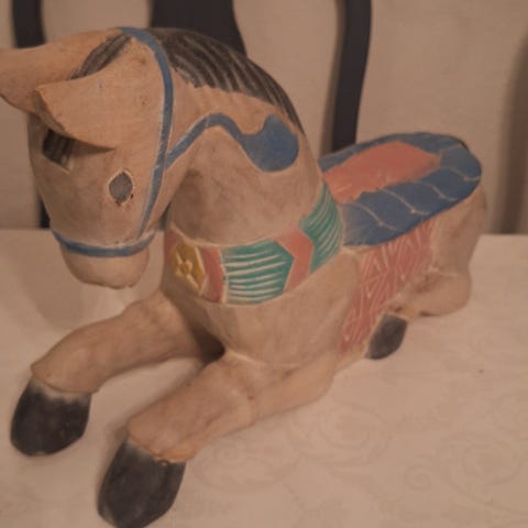 utskjært hest, signert, Se bilder, løsnet bak på ene siden med tauet/se bilder, selges som den er kr 1600