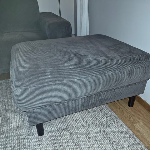 Kvadratisk fargerik puff med kraftig polstret og dypt knappet sittepute i lappeteppestil. Overflaten består av glansfullt stoff som likner velur i mange sterke farger og mønster. Langs kanten er det en rad med metallnagler som gir et mer klassisk, nesten Cherterfield-aktig preg. Understellet har korte, mørke, profilerte ben som løfter puffen 20 m opp fra gulvet.