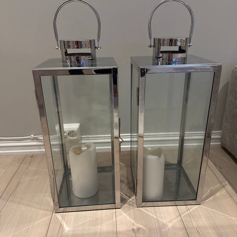 Sett med to lykter i sølv farge og glass. Den ene lykten er større enn den andre. Begge har plass til store blokker med stearinlys. Passer til innendørs og utendørs bruk.