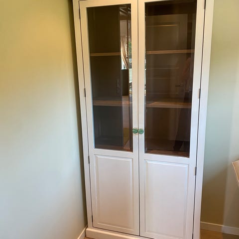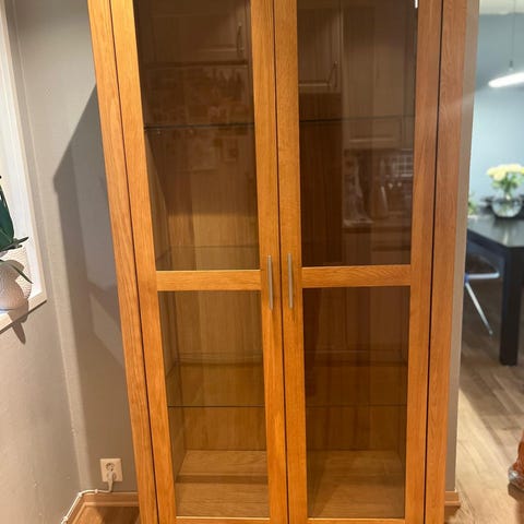 Kvalitetsvitrineskap i heltre eik med glassfronter og solide detaljer. Tidløst skandinavisk design med god balanse mellom funksjon og estetikk. Skapet er pent brukt og fremstår i god stand. Et møbel som varer i mange år.