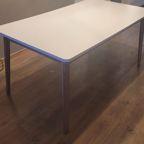 Spisebord fra Jysk selges billig. Bordet er i helt grei stand, men pga noen riper i bordplata har jeg lagt dekorfolie over (se bilde). Ellers ingen feil eller mangler. Demontert.
