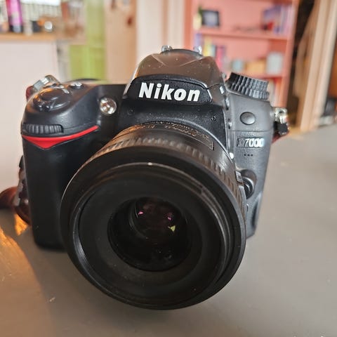 Solid entusiastkamera i god stand. Lite bruksmerker på både hus og linse. Nikkor 16-85 mm 3.5-5.6 G ED VR er en svært anvendelig normalzoom for DX-formatet. Lett, kompakt og skarp, med stort zoomområde og innebygd bildestabilisering.