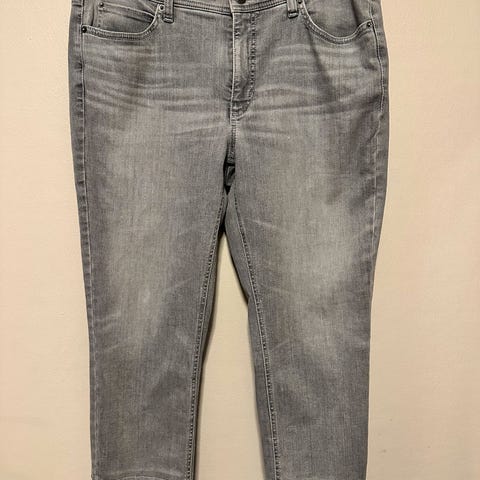 Smal/rett jeans med medium høyt liv. Mørkegrå/sort vask. Ankel kort, men på meg som er 165 cm er den lang.